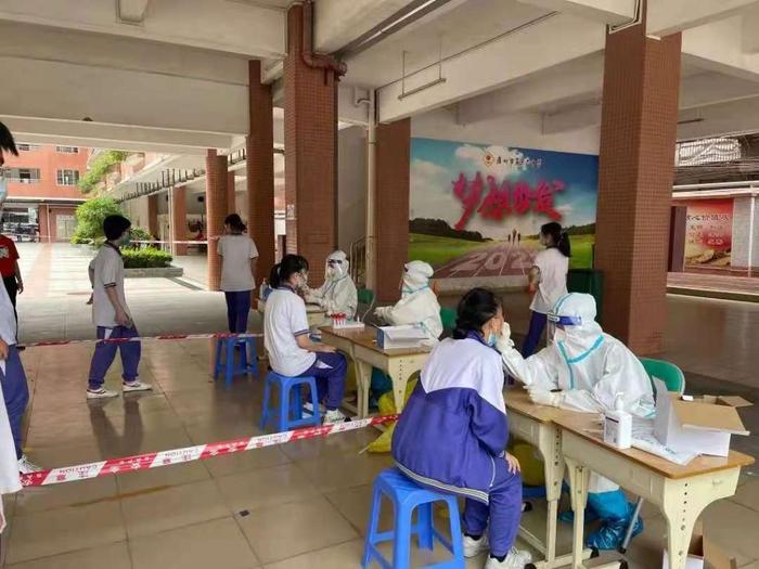 廣州市第十六中學高三學生在做第2輪核酸檢測。