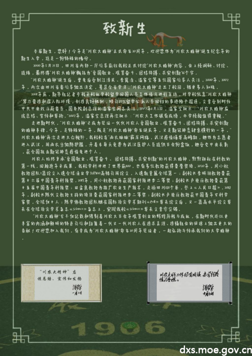 紀念信內容為“川農大精神”誕生歷程及在新時代的傳承發揚,包括溫家寶等多位國家領導人及省政府對“川農大精神”的關注,在新冠肺炎疫情影響下再次走入大眾視野的以優秀校友雨衣妹妹為代表的“川農大精神”故事;以及近三年來,我校眾多教授、專家秉承“愛國敬業、艱苦奮斗、團結拼搏、求實創新”的“川農大精神”,奮斗在科研、教學、社會服務一線,做出的巨大貢獻,以此弘揚大學精神。信的背面則展示2000年7月,由中共四川省委組織部、省委宣傳部和省教育廳黨組號召全省教育戰線學習和弘揚“川農大精神”(川組通[2000]19號)的文書檔案。整個設計嚴肅中不失年輕化校園風,以代表農業的沉穩綠色為主色調,字體活潑,并融合溫家寶總理就“川農大精神”作出批示的檔案資料、校徽、川農牛等元素,給參觀者留下“川農大精神”紀念年的特殊禮物。